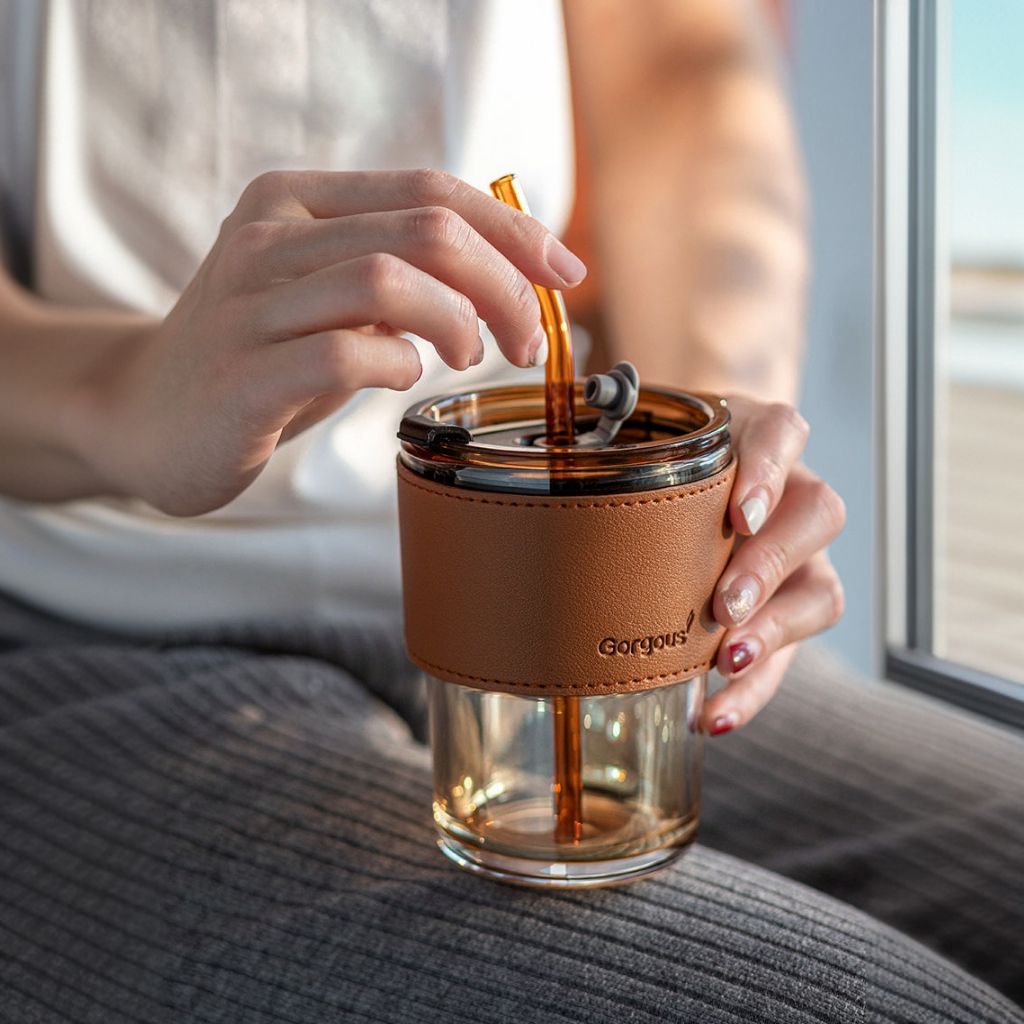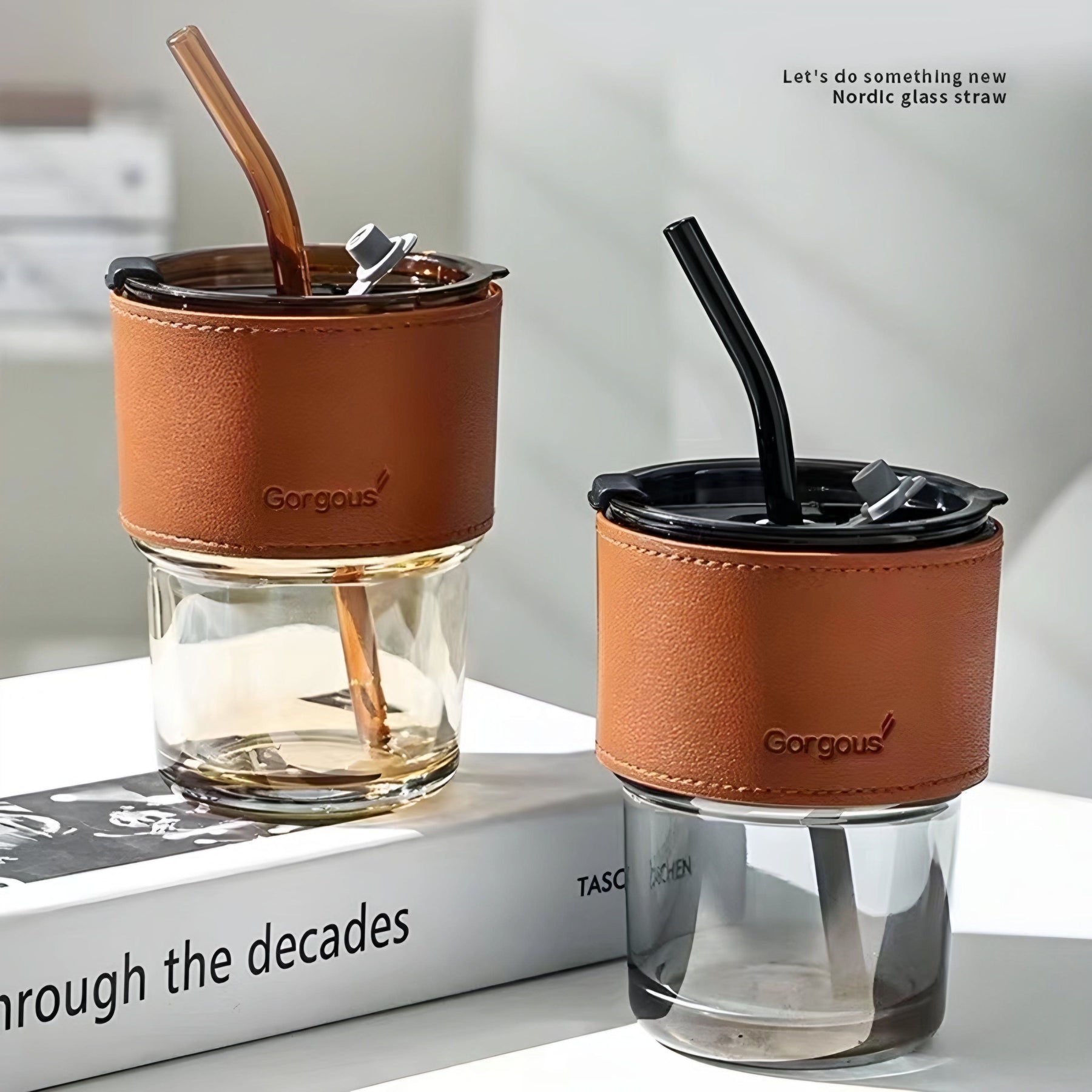 Leather-Covered Glass Sipper Cup with Straw – Classy, Durable & Eco-Friendly